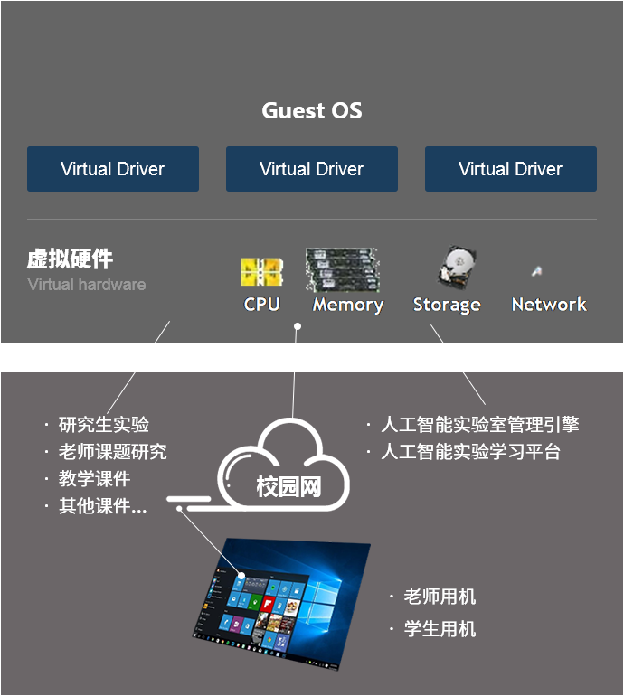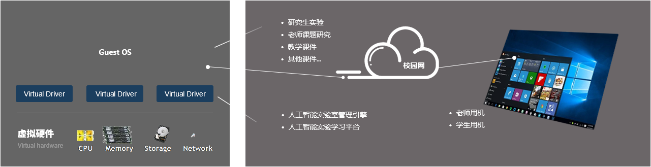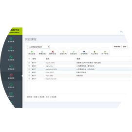 左侧教案、右侧实验环境,学生可以一边学习课程,一边练习。教案可由有文字、图片以及动画组成。支持1.平台预装的课程;2.教师自己制作的课件上传到平台上;3.新增课程后平台自动增加的课件。实验环境是一个可以让学生动手操作的云桌面系统,它内置的GPU的各项驱动并支持虚拟化。