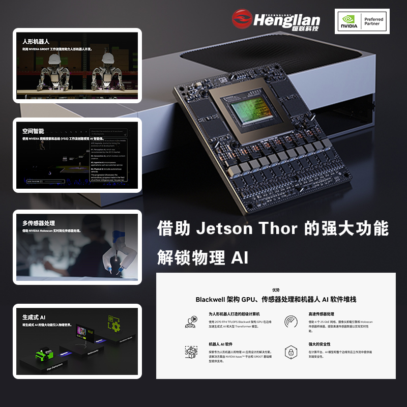 NVIDIA Jetson AGX Thor 专为物理 AI 和通用机器人设计,适用于广泛的应用领域。在制造业中,可用于工业机器人、质量检测、自动化装配等应用;在物流领域,支持仓储机器人、分拣系统、自主配送车辆等;在交通行业,适用于自动驾驶车辆、智能交通系统等;在医疗领域,可用于手术机器人、康复机器人、医疗影像分析等;在农业中,支持农业机器人、精准农业、作物监测等;在零售行业,可用于服务机器人、智能导购、库存管理等。Jetson AGX Thor 的强大性能和高效能耗比,使其成为构建下一代智能机器人系统的理想平台,加速物理 AI 和通用机器人时代的到来。