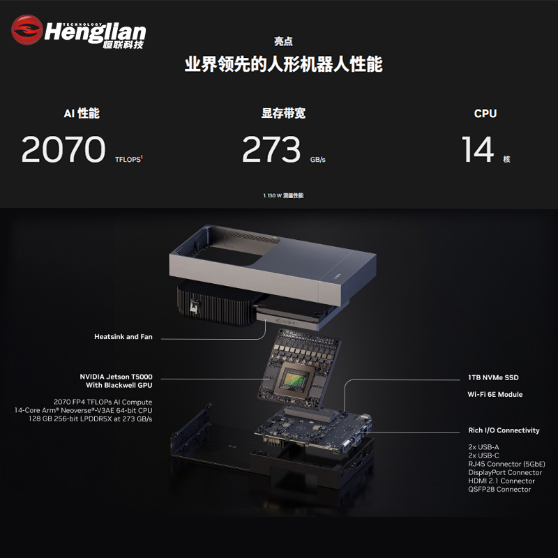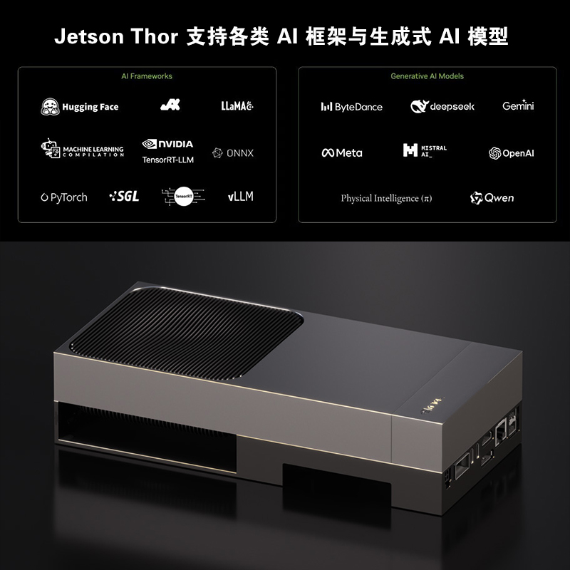 强大的 AI 性能使得 Jetson AGX Thor 能够处理复杂的机器人感知、决策和控制任务,支持实时视觉 SLAM、物体识别、路径规划、自然语言理解等高级 AI 功能,为通用机器人提供"大脑"级别的计算能力。